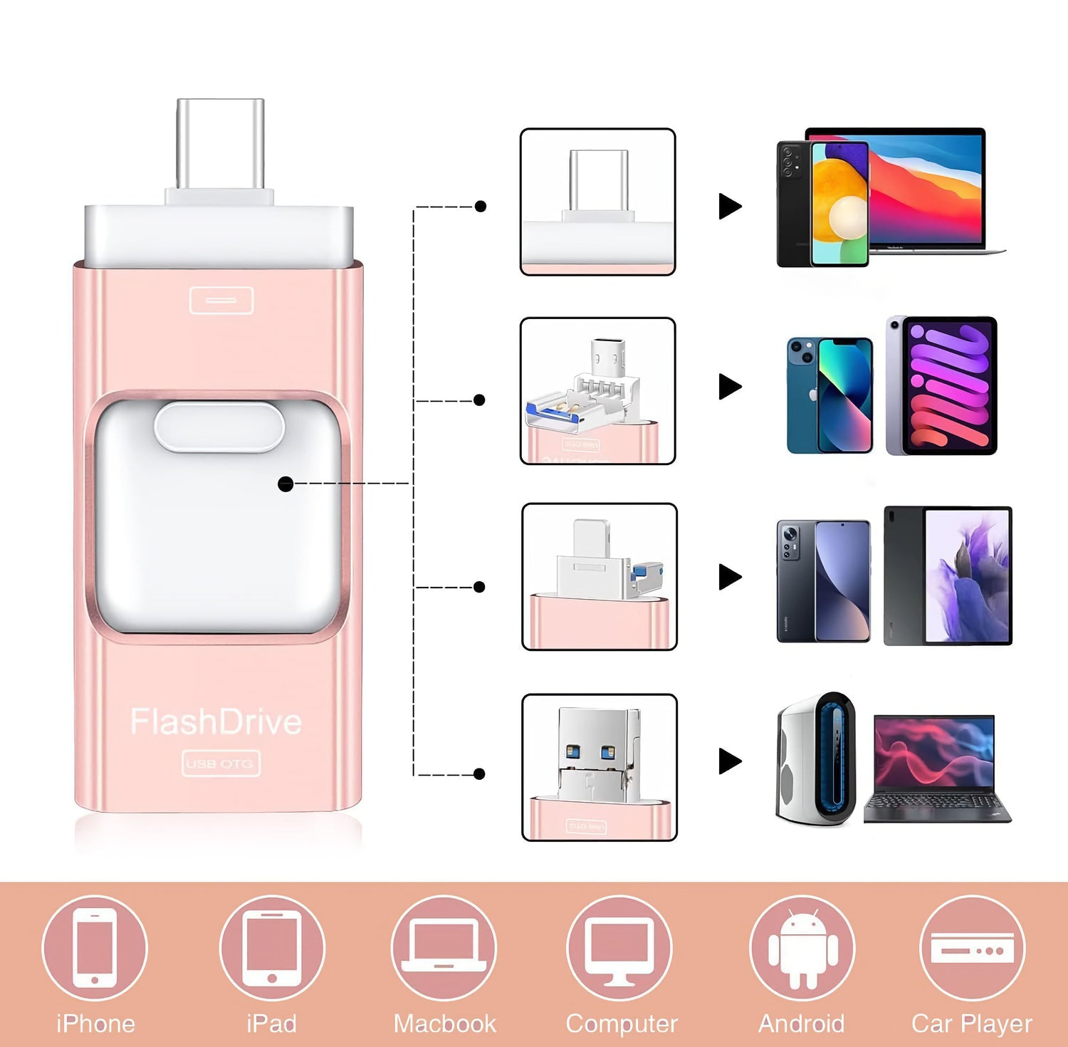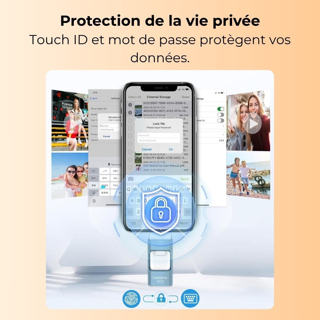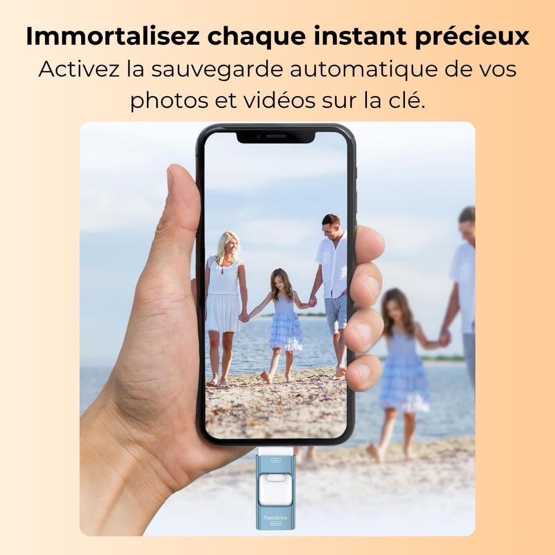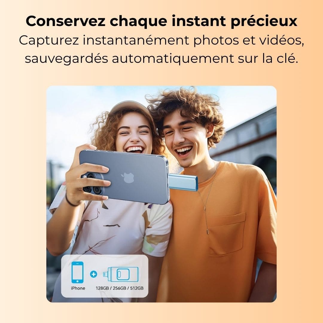 Oui, la clé se connecte aux iPhone, iPad, smartphones Android et aux ordinateurs via la connectique 4-en-1. Sur iOS, installez l’application demandée si nécessaire. Sur Android, activez OTG dans les réglages si requis.