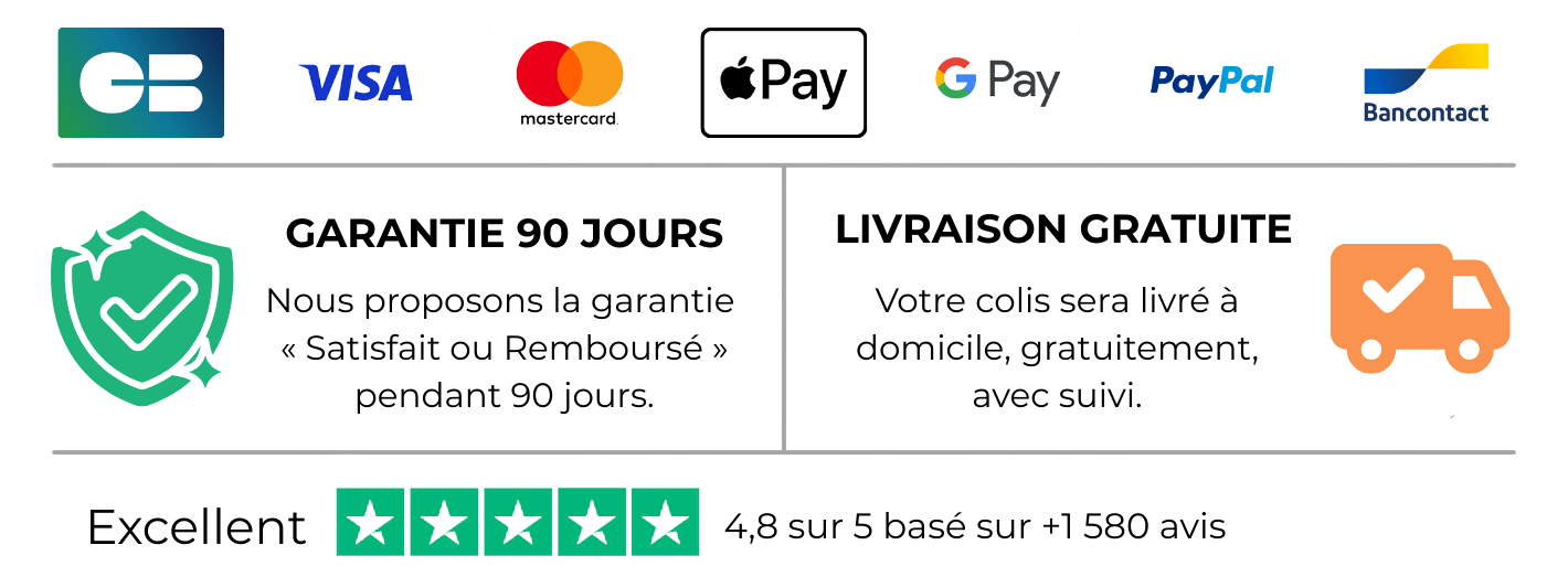 Vous bénéficiez d’une garantie de remboursement de 90 jours, simple et sans risque. La livraison est gratuite dans le monde, nous expédions rapidement et notre assistance répond à vos questions.